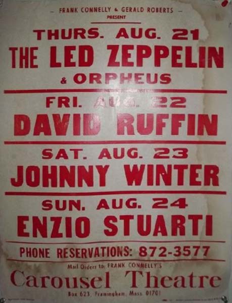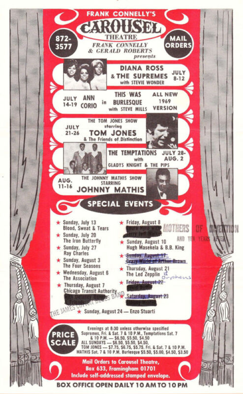 By the late ‘60s, as rock ‘n’ roll came to dominate popular culture, the venue expanded its offerings to attract younger audiences, presenting Jimi Hendrix in 1968 and Led Zeppelin in 1969. Among the other acts who appeared at the Carousel during those years were Frank Zappa and The Mothers of Invention, The Four Tops, The Temptations, The Turtles, Orpheus, Diana Ross and The Supremes, Iron Butterfly, Simon & Garfunkel, Ethel Merman, Johnny Mathis, David Ruffin, Johnny Winter, Tom Jones, Ray Charles, The Lovin’ Spoonful, Ten Years After, The Association, Carol Lawrence, Andy Williams, The Osmonds, Chicago, Liberace, Blood, Sweat and Tears, Peter, Paul and Mary and Tiny Tim. Comedians including Danny Kay, Jack Benny, Phillis Diller, Jerry Lewis and Joan Rivers also headlined over the years.