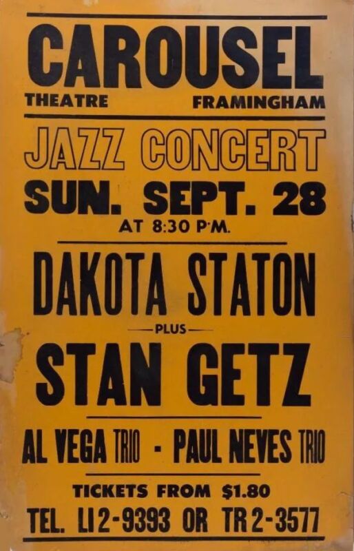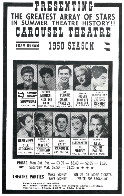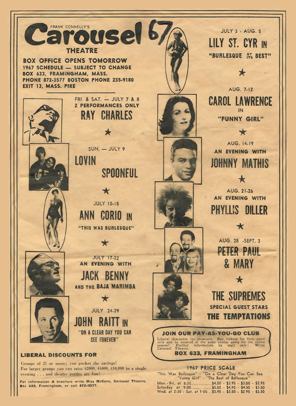 Since the Carousel Theatre in Framingham, Massachusetts was a theatre in the round, it provided audiences with a unique opportunity to see performers from every angle. And during its roughly 10-year existence, the venue hosted a smorgasbord of top talent under its tent, from Broadway and film stars to jazz greats and future rock legends.