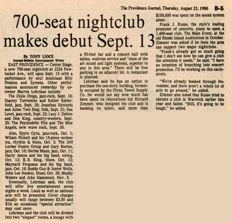 A one-story building previously owned by Flynn Towel Supply Co., Center Stage opened on September 13, 1980. It was divided into two rooms, a lounge with a 55-foot-long bar and a concert hall with tables and table service, and co-owner Martin Lehrman told The Providence Journal before the opening that the venue had “state-of-the-art sound and lighting systems superior to any in this area.” According to Richard Zimmer, who designed the interior and booked talent at the venue, the owners invested over $100,000 (about $383,000 in 2025) on the sound system alone.