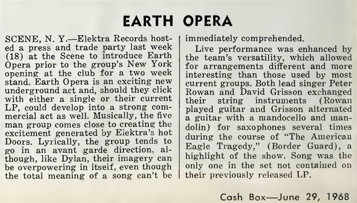Some believed that the Boston-based ‘60s band Earth Opera had a good shot at being the East Coast’s answer to The Grateful Dead. It never happened, but it’s very easy to understand such enthusiasm. The core members were singer-songwriter-guitarist Peter Rowan and mandolin virtuoso David Grisman, with John Nagy on bass, Paul Dillon on drums and Bill Stevenson on keyboards, but their fundamental sound was more rooted in the new psychedelic movement than bluegrass.