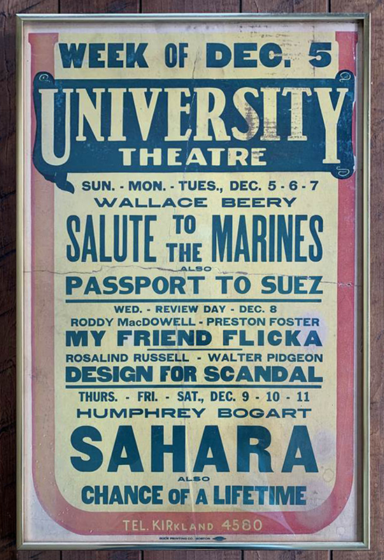 Harvard Square Theatre’s history begins on November 20, 1926, when it opened as University Theatre. Owned by Charles E. Hatfield (treasurer of Middlesex County), Stanley Sumner (owner of playhouses including the Community Theatre in Newton) and Lindey Hooper (a Boston-based financier), it had a capacity of 1,915, according to an article published that day in Motion Picture News. With an interior designed in Italian Renaissance style, a 40-foot-wide screen and a lobby facing Massachusetts Avenue that provided a bird’s-eye view of Harvard Square, it was one of the area’s premier “movie palaces,” attracting north of 1,000 patrons per day. The theatre had a balcony with box seats, a loge section with wicker seats and rocking chairs (both with velvet cushions), a projection room modeled after that of Metropolitan Theatre (now Boch Center) and an asbestos fire curtain that pictured George Washington commanding the Continental Army on Cambridge Common during the yearlong Siege of Boston in 1775/’76.