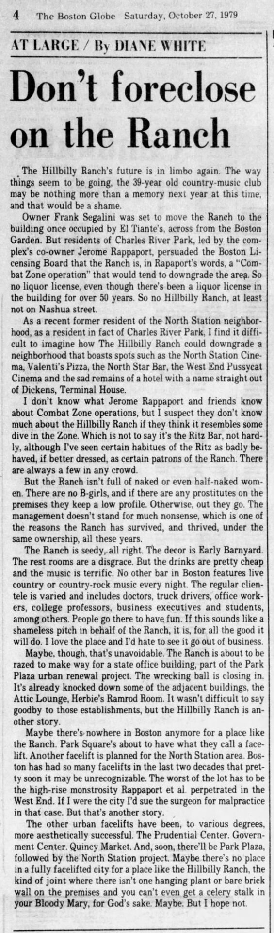 Like many other neighborhoods in Boston, Park Square changed radically in later years. State buildings, parking garages and high-end eateries eventually replaced tiny restaurants, bars and even the old bus terminal. Walking through the Square today, it’s practically impossible to envision the Ranch anywhere near Eliot Street, where it was once a heaping slice of down-home country culture within a bustling urban backdrop.
