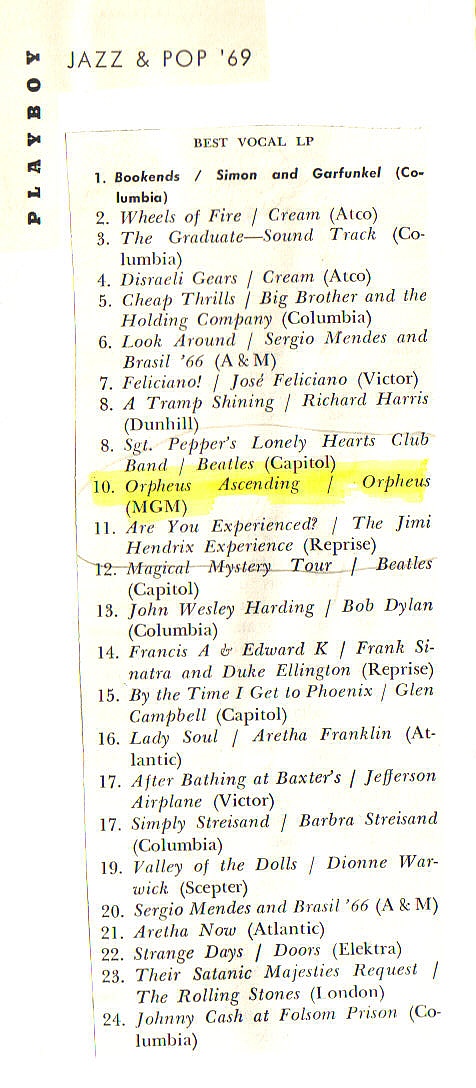 In April 1968, just three months after finishing their debut album, the band recorded its sophomore effort, Ascending, which landed at #10 on Playboy’s Best Vocal LP list that year, between The Beatles’ Sgt. Pepper’s Lonely Hearts Club Band and Jimi Hendrix’s Are You Experienced? In 1969, MGM released the third Orpheus record, Joyful, featuring the single “Brown Arms in Houston,” which charted well. One critic said the album was “equal to their outstanding debut.”