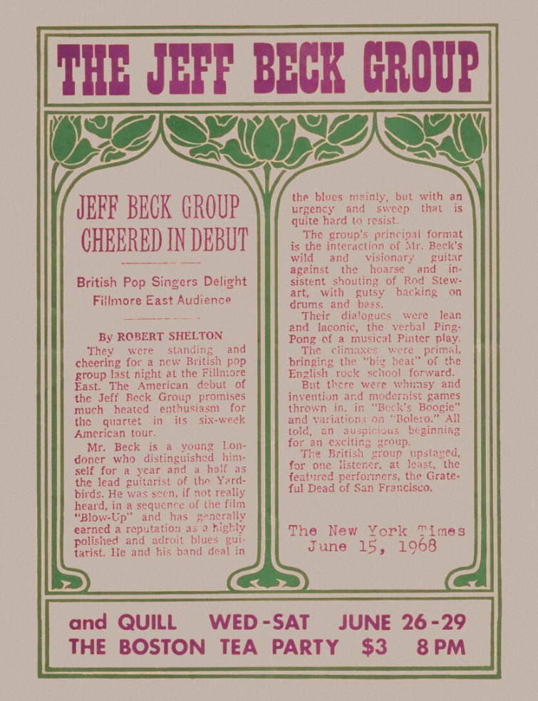 By mid-1967, Quill was performing across New England and upstate New York, appearing multiple times at The Boston Tea Party through 1968. A loyal regional following led to them opening for major acts including The Who, The Kinks, Deep Purple, The Grateful Dead, Sly and The Family Stone, Janis Joplin and The Jeff Beck Group along with appearances on local television in Boston and the Midwest.