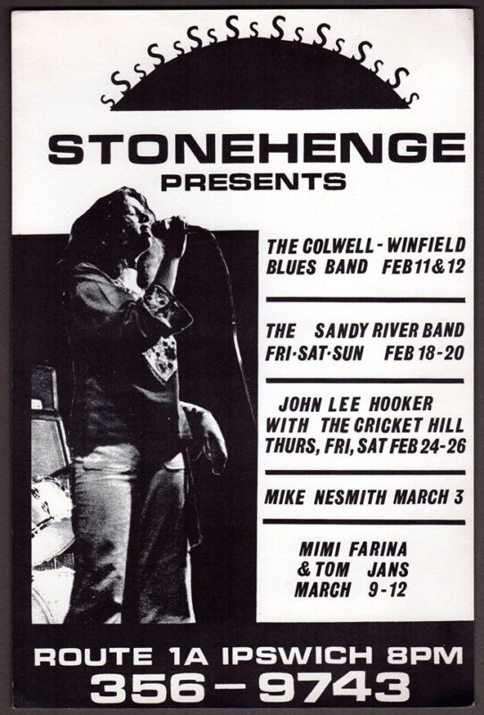 In the mid-1960s, the building was the site of the well-known folk club King’s Rook, where artists including Tom Rush, Richard and Mimi Fariña, Judy Collins and Paul Butterfield appeared. In 1969, new owner Phil Cole (whose day job was manufacturing machine tools) and manager Don Montrose, both from nearby Gloucester, relaunched the room as Stonehenge, presenting more plugged-in acts, although acoustic artists continued to appear and local bands frequently opened for the headliners.