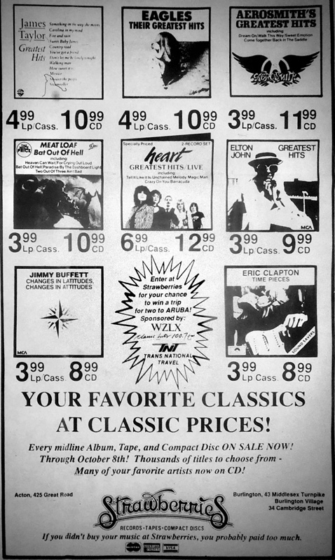 In the decades before “downloading” and “streaming” meant anything to the average Joe, Strawberries Records & Tapes was the go-to spot for millions of music junkies, a place where they could score LPs, EPs, 45s, cassettes, 8-tracks, CDs, DVDs, posters, t-shirts, fanzines and concert tickets and see some of their favorite artists making promo appearances. The stores were playgrounds of a sort for teens and twentysomethings since they could hang with friends while doing what they did as early and often as possible: comb through album bins, admire cover art, read lyrics and liner notes and learn the names of the singers, musicians, producers and engineers who turned their rock ‘n’ roll dreams into reality. In pre-Internet New England, when the only thing better than going to a concert for the region’s air-guitar masses was rummaging around in a record shop, Strawberries became a cornerstone of youth culture, particularly in the suburbs, and working there part-time was as close to a dream job as most high schoolers could imagine.