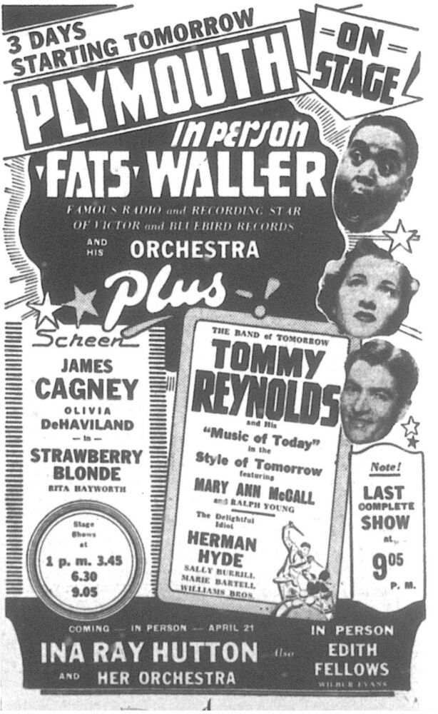 Just seven months later, however, in June 1929, the Plymouth closed its doors (reportedly due to “management problems”) and remained shuttered through the ‘30s as the Great Depression crippled the US economy. After reopening in the early ‘40s, it became one of New England’s swingin’est, swankiest spots for world-class jazz – Worcester’s equivalent of Boston’s Cocoanut Grove (without the tragic fire) – with tickets priced at 35 cents for matinees and 50 cents for evening shows. Among the acts that appeared were Cab Calloway, Peggy Lee, Ina Ray Hutton, The Ink Spots and orchestras led by Count Basie, Benny Goodman, Harry James, Stan Kenton, Louis Prima, Charlie Barnet, Fats Waller Louis Jordan, Erskine Hawkins, Bobby Byrne, Tommy Tucker and Johnny Long.